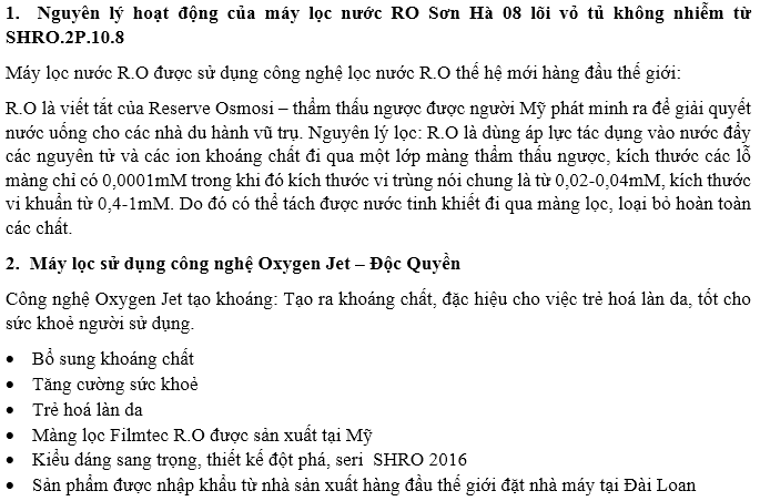 Máy lọc nước ro sơn hà 08 lõi vỏ tủ không nhiễm từ SHRO.2P.10.8 sản phẩm được nghiên cứu sản xuất đáp ứng nhu cầu về đảm bảo nước sạch cho người tiểu dùng.