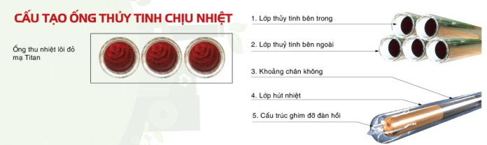 Đây là loại ống đang được sử dụng khá phổ biến tại các hộ gia đình. Ống có cấu tạo gồm 5 lớp: lớp thủy tinh trong suốt, lớp truyền nhiệt, lớp chống bức xạ tia hồng ngoại, lớp hấp thụ ánh sáng, lớp chống bám cặn bẩn. Ống thủy tinh chân không đạt hiệu suất hấp thụ nhiệt cao nhất, vì nước trong ống thủy tinh được ánh sáng mặt trời đốt nóng trực tiếp. Bởi giá thành rẻ và dễ dàng thay thế nên dòng máy lắp đặt ống thủy tinh chân không thường có giá thấp hơn các dòng máy khác.Nhưng bên cạnh đó thì sử dụng ống thủy tinh chân không lâu ngày sẽ có những cặn bẩn bám trong lòng ống do nước được đưa trực tiếp vào ống, nên gây ảnh hưởng đến hiệu suất hấp thụ nhiệt. Chính vì vậy mà bạn cần vệ sinh sục rửa thường xuyên để máy hoạt động tốt nhất.