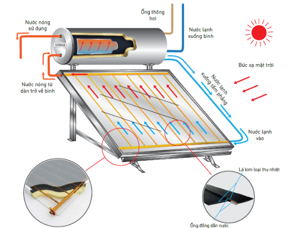 Tấm phẳng thu nhiệt được cấu tạo bởi lớp kính cường lực ở trên có kết cấu dạng thấu kính tăng hiệu suất hấp thụ nhiệt và chống chịu tác động bên ngoài bảo vệ sản phẩm bên trong, hệ thống ống đồng dẫn nước, lớp bảo ôn phía dưới làm tăng hiệu quả làm nóng nước. Sử dụng bộ hấp thụ nhiệt bằng tấm phẳng. Ưu điểm của dòng máy này là hoạt động nhờ bộ điều khiển nên khi không có nắng vẫn có nước nóng để dùng, nhưng lại có nhược điểm là khi bị mất điện thì máy không hoạt động được.